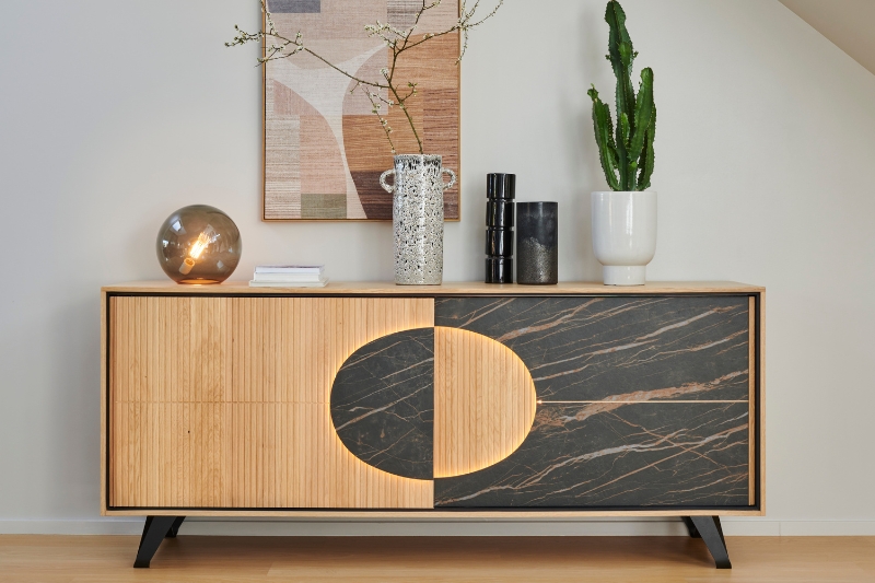 L’un des autres gros points forts du buffet bois et céramique est qu’il s’accorde à de nombreux styles déco, du contemporain à l’industriel chic, en passant même par des courants plus atypiques comme le japandi. Il fait ainsi écho aux envies d’un mobilier aussi esthétique qu’utile, qui participe à la structuration d’une pièce tout en s’y intégrant harmonieusement. Dans sa singularité, il répond également au besoin de se démarquer avec des meubles originaux, qui ne sont pas rattrapés par les standards perçus par certains comme trop uniformisés.